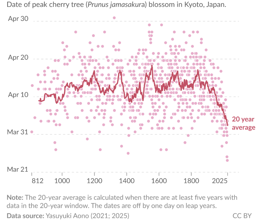 In addition to astronomical and climatological seasons, there are other ways of defining the seasons as well. One method of measuring the start of a season is through the use of phenology, the study of when a particular environmental event is observed to occur. This could be the first leaf on a honeysuckle bush, the first cherry blossom, or the first date a northern lake is frozen over in winter. Gardeners’ observations are critical in marking the change of seasons using phenology because they carefully watch the plants and animals in their local landscapes over time. The National Phenological Network in the United States is a citizen science effort underway for many years that catalogs the changing seasons by monitoring and recording a variety of phenological events as reported by gardeners and others. Many other countries have similar phenological societies that catalog the first blooms of different trees and flowers as well as changes in rivers and lakes or the appearance of migratory birds like robins for the first time each spring. Maybe some of you contribute to this effort in your own community or country. Some countries like Japan have kept records of first cherry blossoms on particular species of trees for hundreds of years and have seen how this has changed over time. This allows us to see long-term trends in climate based on based on how changes in temperature and precipitation are affecting the way plants grow.