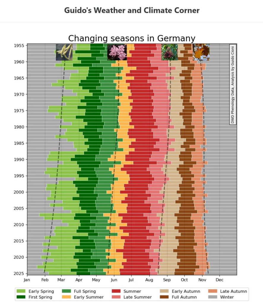 Use of phenological data has allowed us to study changes in climate in a new way. A recent study of seasons defined by the phenology of different native plants that bloom at different points in the year has shown that the seasons as defined by these plants have changed in Germany (Guido Cioni). According to their research, spring, summer, and autumn (as defined by phenology) are all starting earlier in the calendar year than they did in the past. This might sound odd, but if you think about how plants grow, it makes more sense. Once plants begin their life cycle of producing leaves, blossoms, and fruit, they progress through that life cycle on a regular schedule that is controlled by the climate that plant is growing in as well as by their genes. If spring starts earlier due to the warming climate, then the plant will grow and propagate on its own regular schedule and will finish its life cycle earlier than when the climate was cooler. This has some unfortunate consequences for insects, birds, and other animals that depend on the fruit of particular plants, since they may occur earlier in the year than in the past and that may not match the needs of those animals for migration or preparing for hibernation.