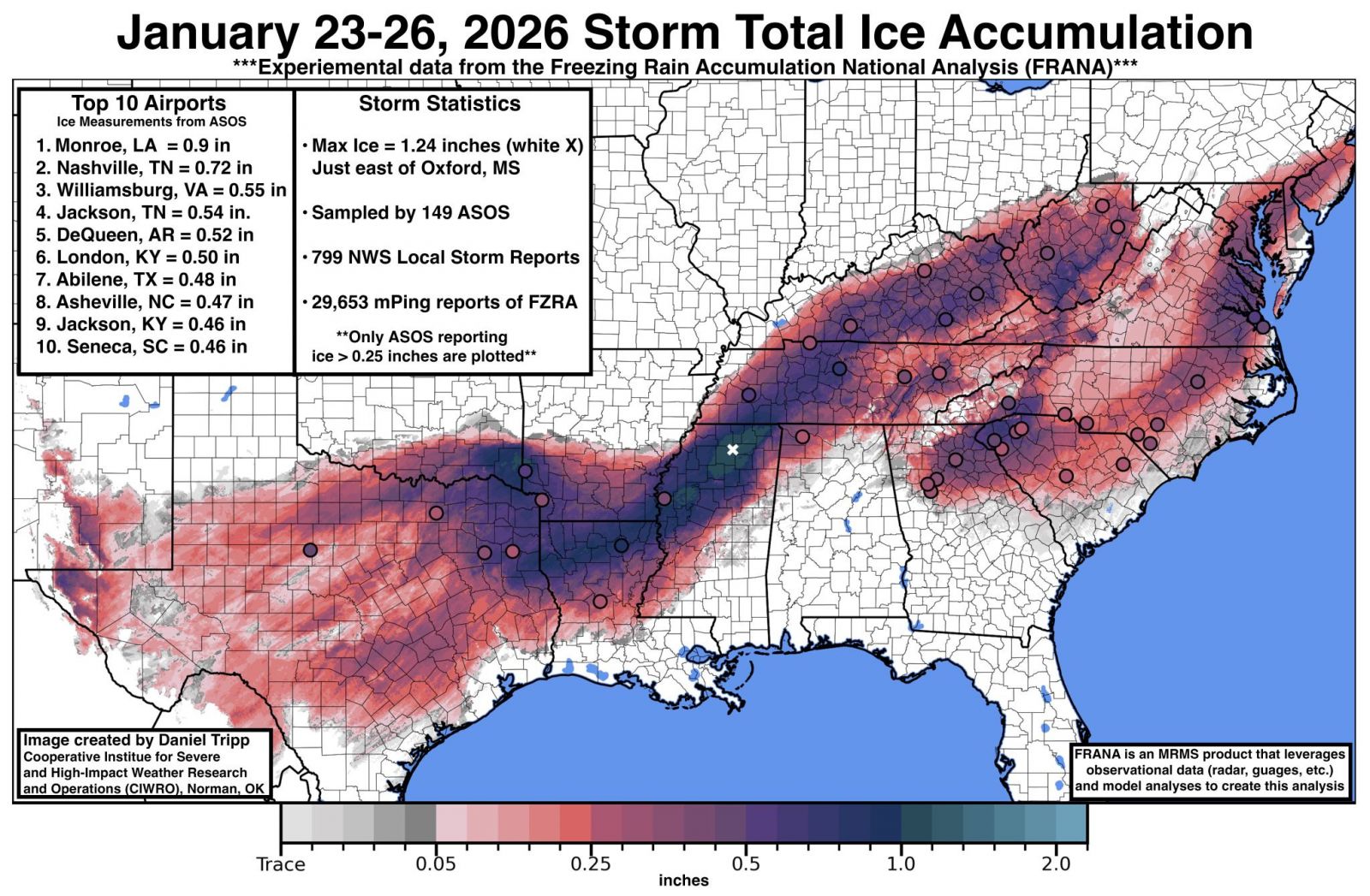 The flow does not always move in the same direction. You might remember the Texas freeze of 2021, which brought frigid air into Texas, straining their power supplies and leading to widespread power outages during very cold conditions. This year, the southward surges of the coldest air have headed towards the eastern United States, providing the source of freezing air that has contributed to the development of the ice storms and snow. The type of winter precipitation that forms depends on the vertical temperature structure of the atmosphere where the moisture is falling, which can be different in each storm.